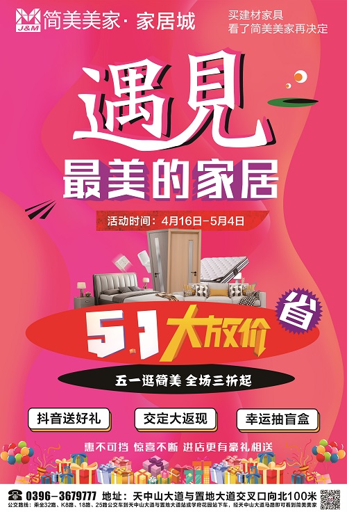 活动期间,凡是关注简美美家“抖音号、客服号”,每周一至周五、顾客凭关注抖音线上抢购3折起特价产品!更有500份精美礼品等您免费领,数量有限,送完即止。